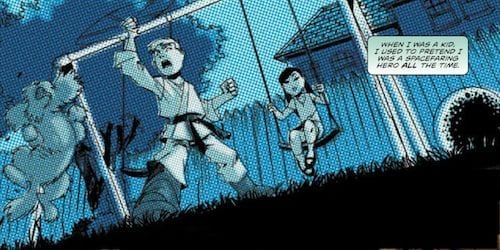 Speaking of classic, Randolph’s graphics are simple yet eloquent with bold line usage that accentuate the sleek looks of Benjamin’s and Tara’s oversuits as well as varying degrees of motion, which offers a slight hint of the old Fleischer Superman cartoons of the 1940s. If you look closely and use just a bit of imagination, you might notice that during Benjamin’s childhood flashback, his spacefaring hero costume looks a bit like that of Flash Gordon’s, which is a fun little Easter egg surprise.