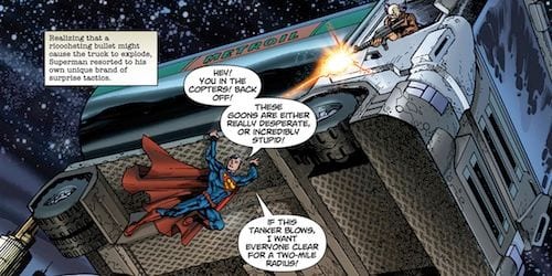 When it comes to fashion, however, Superman is all about change. He no longer sports the red underpants on the outside of his costume. There was a time and a place for that kind of thing, and that time has passed. And instead of stretchy, Spandex material, he seems to be wearing a reinforced, light, armor-like suit. In addition, Superman’s belt has changed from yellow to red. He also sports a mock turtleneck, which baffles me because the intent, at least I thought, was to make the costume more modern and serious. So, why then, the flashback to the 90s?