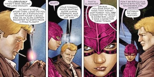 Last month, the recently recruited Dr. Mist revealed himself to be a traitor, not only to the JLD, but also to Steve Trevor as an agent of A.R.G.U.S. The new storyarc, “War for the Books of Magic” picks up exactly here, right at the point where Dr. Mist is revealed as the traitor. After a quick, one-page Mist origin story to get the scoop on why he’s helping gross old Felix Faust, we get back to the present as Mist and Faust escape the Black Room. John Constantine and the rest of the gang are bewildered and left to speculate Faust and Mist’s whereabouts. Of course, a few magical tricks and Constantine’s wandering eyes give them two locations to investigate. The first is Slaughter Swamp, the location of the Books of Magic that Constantine saw before getting magically sucker-punched by Dr. Mist. The second is Peru, back at the temple where this all began, as divined by Zatanna. Steve Trevor sends Constantine and Black Orchid to the swamp, while Deadman and Zatanna take Peru. Just like Buffy, the gang has to split up to complete their mission.
