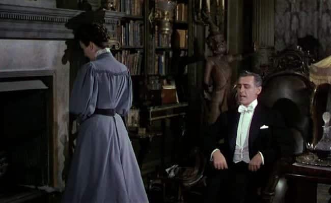 Shot in England for Columbia, this is a Victorian thriller whose story should be discovered by the viewer step by fog-shrouded step. It begins with a funeral attended by grieving widower Stephen Lowry (Stewart Granger). When he returns to his posh mansion, with the camera tracking his broad back through gates and doors that he never closes behind him (or else we couldn’t follow), we get our first well-played indication that he is not what he seems. Neither is the put-upon little mouse of a housemaid, Lily Watkins (Jean Simmons, Granger’s wife), who dares to reach beyond her place and surprises even herself with her cool audacity. The viewer follows spellbound as their machinations twist around each other in an unpredictable pattern of alliances and cross-purposes.