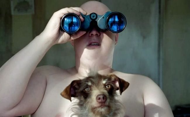 Small Apartments offers an overload of smells, sounds, and textures in its visual depictions. One gets that sense when watching the main character, Franklin Franklin. He’s an obese, pasty, 32-year-old who lives in a dingy apartment complex with his dog, survives on pickles with mustard and Moxie soda, and spends his days in his underwear, only occasionally complementing his ‘outfit’ with a wig for his bald head. He dreams of moving to Switzerland to play the alphorn, which he practices to the displeasure of his neighbors.