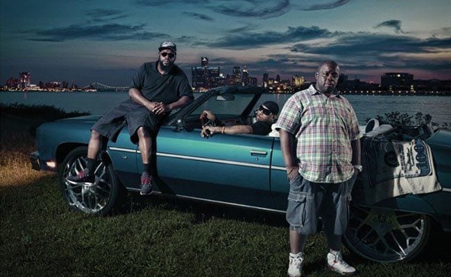 Neighborhood Fireworks on the Fourth of July, Goldengate Street, Detroit from 2014 shows a group of friends on a somewhat dilapidated front porch watching the streaming rockets of a fireworks barrage in full force in the foreground. Risher, who relocated back to the city after many years in New York as a fashion and advertising photographer, is represented by a series of portraits of Detroit hip-hop artists, including Awesome Dre and the Hardcore Committee, Guilty Simpson, Hex Murda, and J Dilla collaborator Phat Kat. In the work of both Jordano and Risher, the gritty determination of the denizens of the D to abide against all odds shines through.