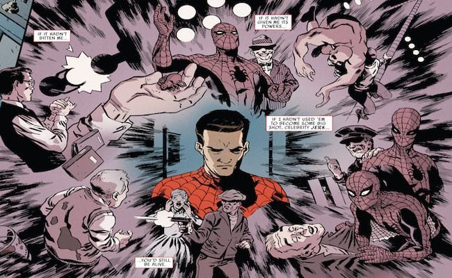 Slott’s tale does more than recount the familiar elements and story beats, however. Without Stan Lee’s omniscient narrator, the tale unfolds mostly from Peter’s point of view. (And that of a new character, introduced in the supplement to last week’s Amazing Spider-Man #1.) The effect is to allow Peter’s motivations to be at the center of this story. The simple version of the origin of Spider-Man’s crime fighting career has always been inaccurate. Lee and Ditko’s Peter developed into a crimefighter over time. He did not walk away from Uncle Ben’s grave fully formed, all “great power and great responsibility.” His motivation to make a difference may spring from the death of Uncle Ben, but in those early days it was often centered on making money to help Aunt May instead of patrolling the city to fight crime and help those in need. Slott digs even deeper into Peter’s motivations. He sets up what looks like will be Peter’s slow awakening to the kind of man Uncle Ben was and what it might mean to carry on after his death, to use his great power responsibly. At the end of this issue, Uncle Ben is dead and buried and Spider-Man is still saying: “All I wanna know is . . . when do we get paid?” Peter is not yet a hero. We know, from our vantage point, what kind of hero he will become; we do not know, at the end of this issue, how that hero will rise.